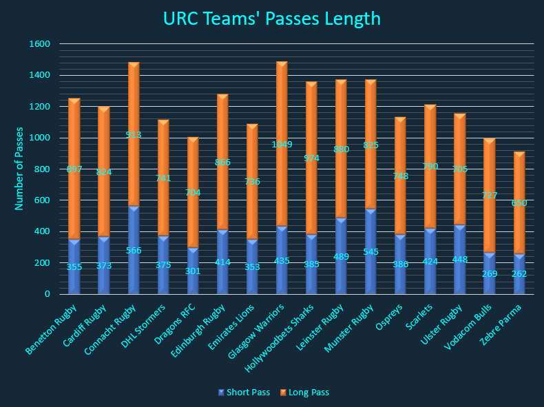 When ‘long passes’ are referred to on TV they normally mean 30m+ Hollywood balls. Here, a long pass is anything above one or two metres and a short pass is anything within that. All teams throw more long passes than short, but Irish teams throw a much higher proportion of short passes whilst South African teams tend to throw fewer.