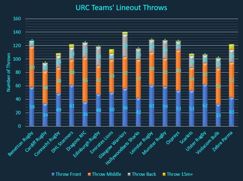 Throws beyond the 15m are very rare, with 9/16 teams having taken that option just once. Only Zebre and Lions are using that option anywhere close to regularly.