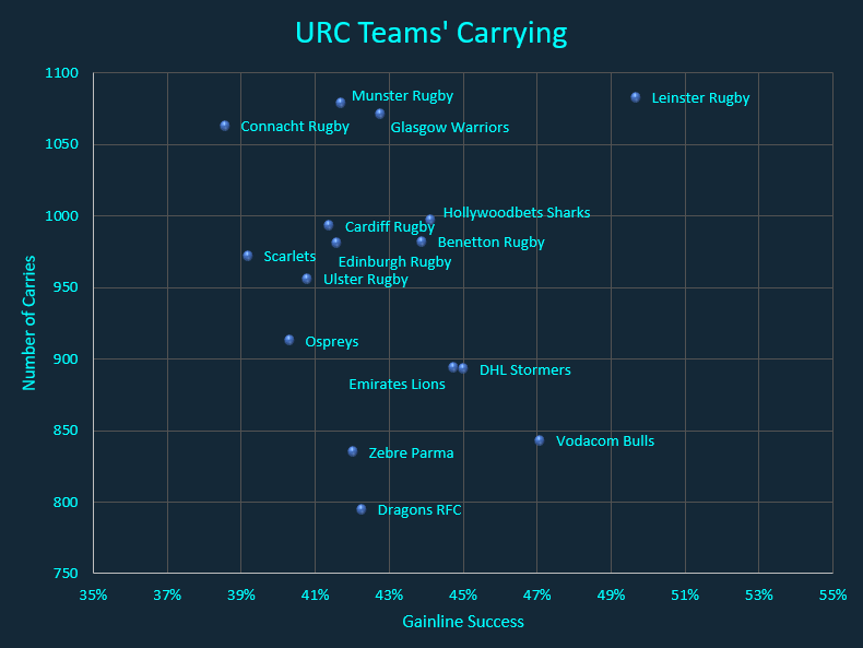 We see a very high variance in carrying statistics throughout the URC. Three out of the top four carrying teams are Irish while three of the bottom five carries are South African teams.