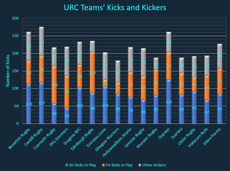 We know that kicking is a vital aspect of rugby with research suggesting the teams who kick the most usually win. Here we see that Benetton, Cardiff and Ospreys kick the most in the URC and most teams are between 200 and 250 kicks so far. Intriguingly, five teams are below the 200 mark, including three of the teams in the top six. Is the URC bucking the trend?