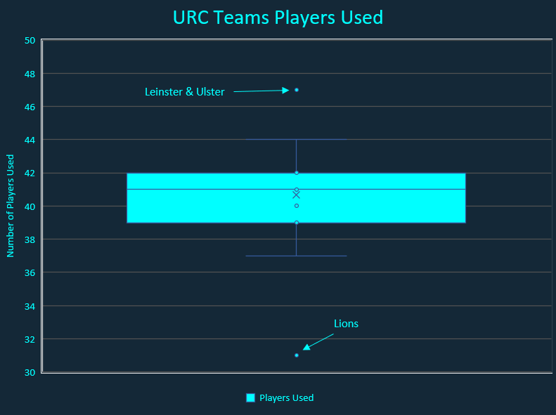 At the halfway mark, most teams have used between 39 and 42 players. The outliers are Leinster and Ulster at the top who have used 47 each whilst the Lions have used a remarkably low 31.