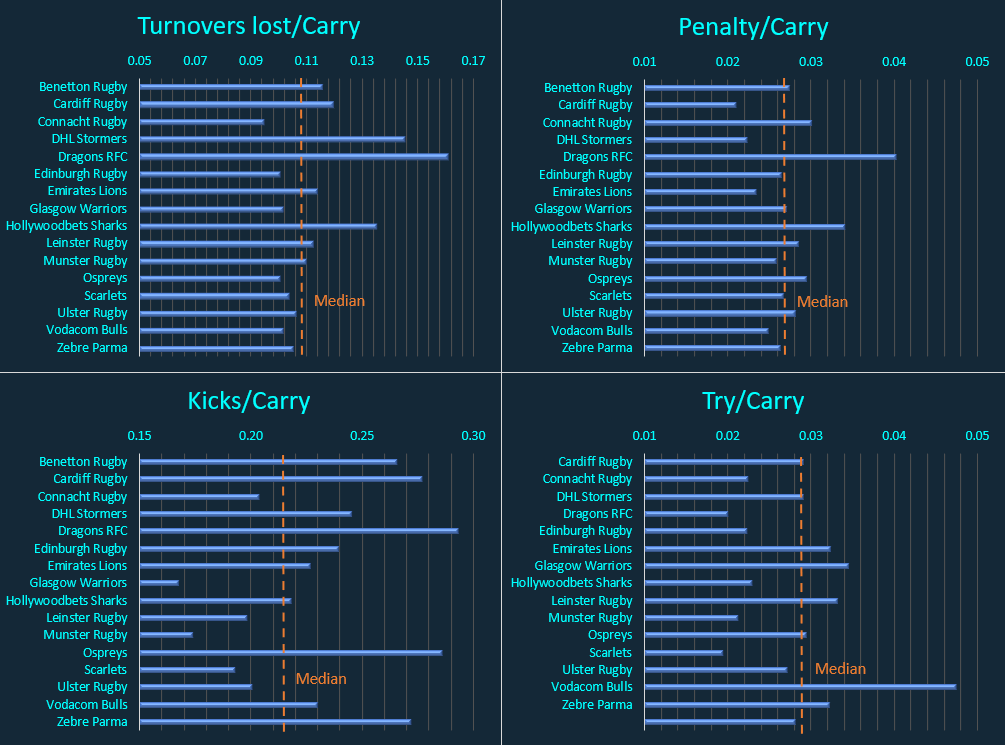 We can see that the Dragons and Sharks - the two bottom sides in the competition - are the most likely to conceded a turnover or a penalty whilst carrying. Dragons are also the most likely kick the ball away when they have it, followed by fellow Welsh region the Ospreys.